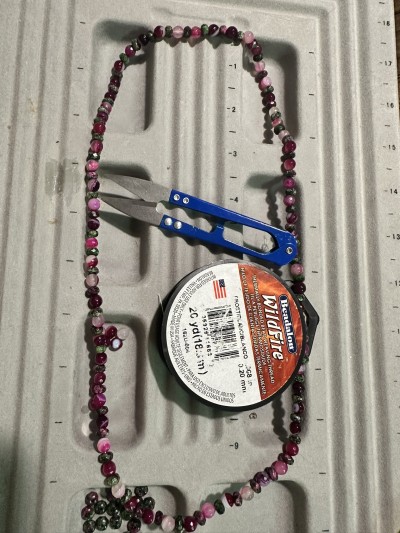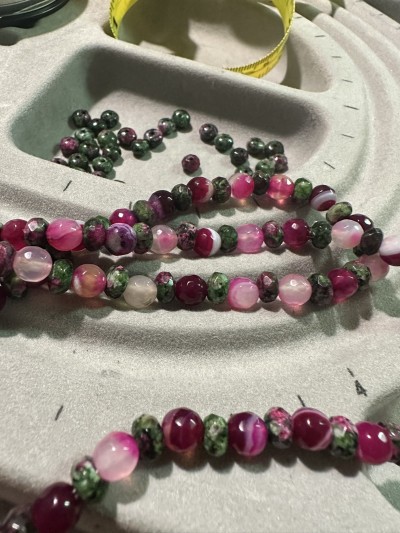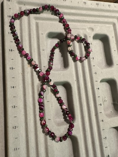 This is a fun, cute necklace with ruby-in-zoisite beads and agate beads! Show off your unique style with the color-combo of pink/magenta and green, with white. Its a slip-on/off necklace, with no clasp, strung on thermally-bonded weaving thread, secured with a tiny dot of glue. It’s approximately 25”.