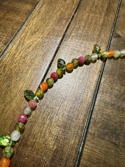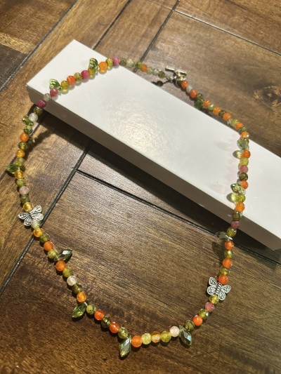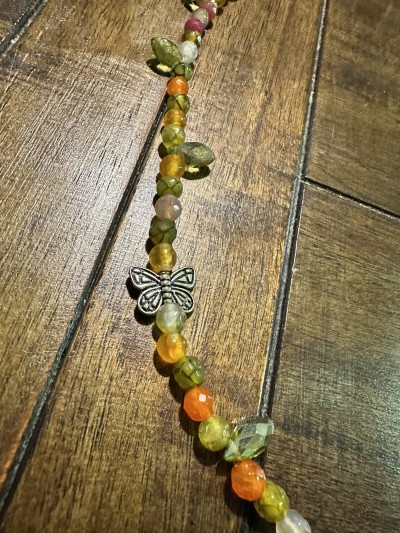 Fun 22 1/2" long necklace with green crystals, agates in varying shades of green, orange, and pink, with butterflies and toggle clasp.