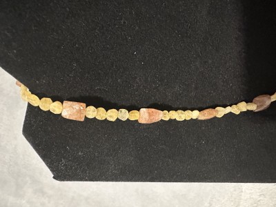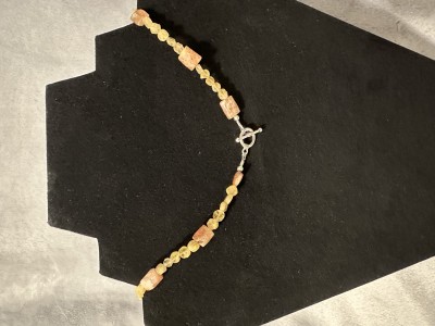 Not gonna lie - when I made this necklace I thought it looked like little bits of baked potato soaked in butter, with some bacon bits. In reality it's heliodor and sunstone. Don't eat it. It's not food. 19.25" with a toggle clasp.