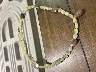 Earthy, beautiful necklace with oval and square prehnites, 4 spiderweb jaspers, and 1 Oregon opal focal bead. Its 24” long, including chain and lobster clasp, 22 3/4” without chain.