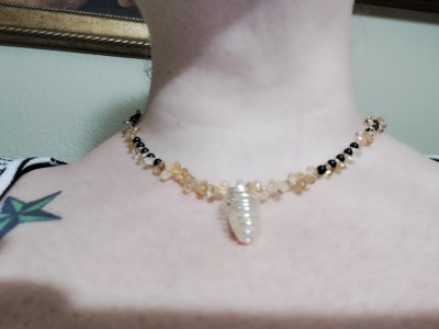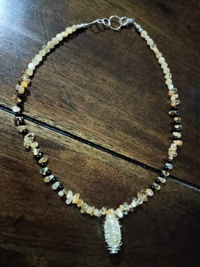 One of a kind choker/necklade made with heliodor, citrine, and onyx beads, with silver-tone accent beads, and a loose polished citrine stone in a handmade silver-plated wire cage. It is 18 1/2" long, strung with beading wire, with a lobster clasp.