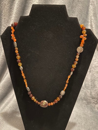 This 22" long necklace has dainty carnelians, bold agates, a stunning spiderweb jasper, and pewter accents. Hook clasp.