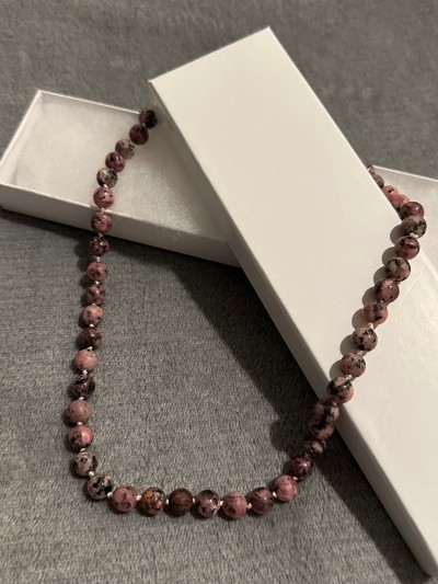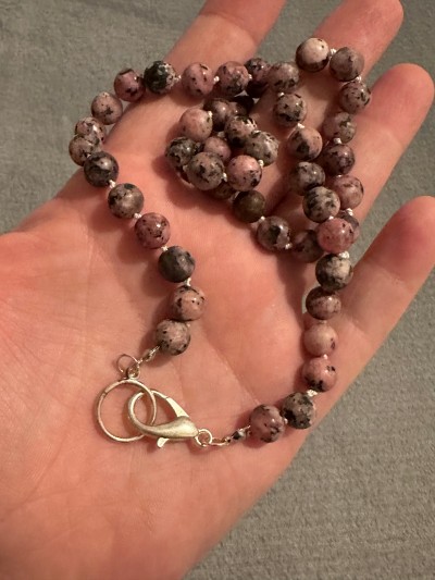 Pink jade necklace, alternating shiny and matte pink jade beads, white silk thread, pearl-knotted, lobster clasp, 20".