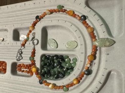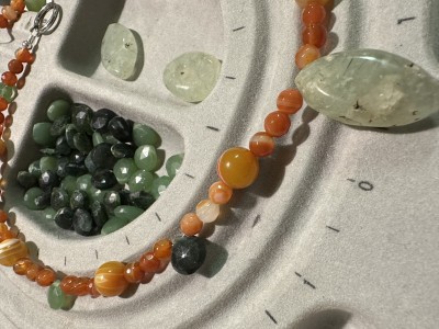 A bold, vibrant, colorful necklace featuring orange agates, 2 shades of green serpentine, and a large prehnite focal bead.