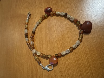 Slip this necklace on and the breeze gets a little cooler, and the smores get a little tastier. It features agates, sunstone, and 3 carnelian briolette focal beads. It's 18" long with a lobster clasp.